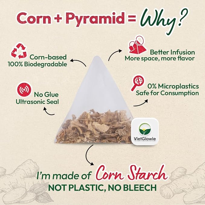 VietGlowie 30 Ginger Pyramid Tea Bags, 3.5g/bag to 33oz, Ginger Root Herbal Tea, Warm & Spicy, Support Digestion, Boost Immunity, 100% Natural, No Caffeine, Corn-Based Tea Bags