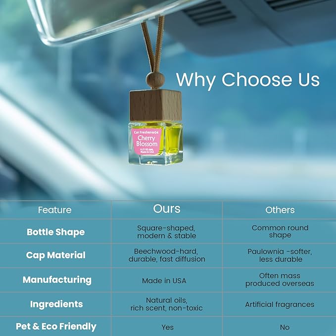 - 【Elegant Design with Premium Materials】More than a car fragrance—this is a piece of décor. Choose from sleek square glass bottles or diamond-cut designs that sparkle in the light. Each cap is crafted from pine or beech wood for better heat resistance and superior scent diffusion compared to ordinary round caps, ensuring even fragrance release.