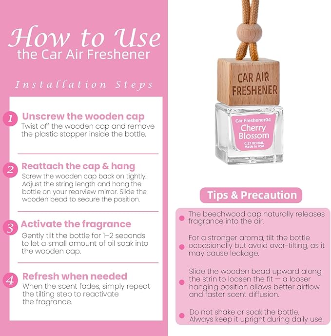 - 【Easy to Install, Adjustable Scent Strength】Our hanging essential oil diffuser installs in just three steps—remove the stopper, screw on the cap, and hang from your rearview mirror. Need a stronger scent? Simply tilt the bottle to let oil touch the wooden cap for an instant boost. The adjustable strap fits any car model without blocking your view, ensuring safe and comfortable driving.