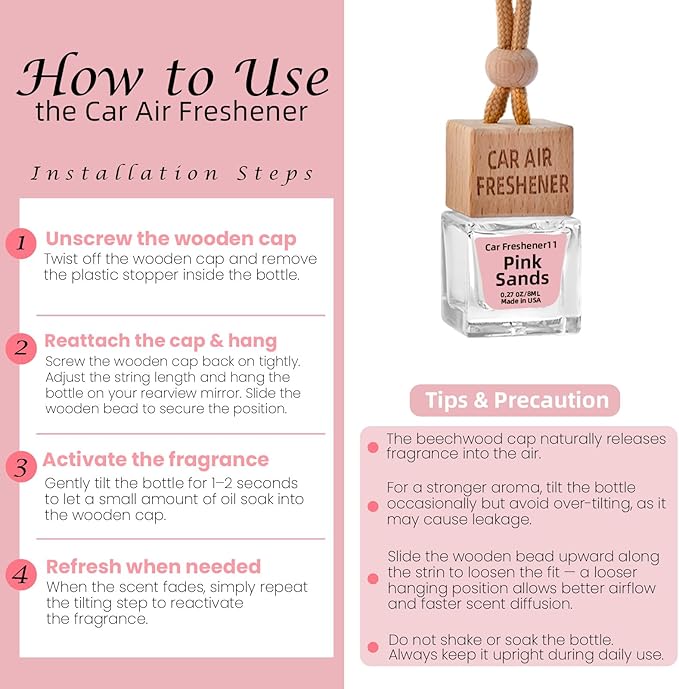 - 【Easy to Install, Adjustable Scent Strength】Our hanging essential oil diffuser installs in just three steps—remove the stopper, screw on the cap, and hang from your rearview mirror. Need a stronger scent? Simply tilt the bottle to let oil touch the wooden cap for an instant boost. The adjustable strap fits any car model without blocking your view, ensuring safe and comfortable driving.