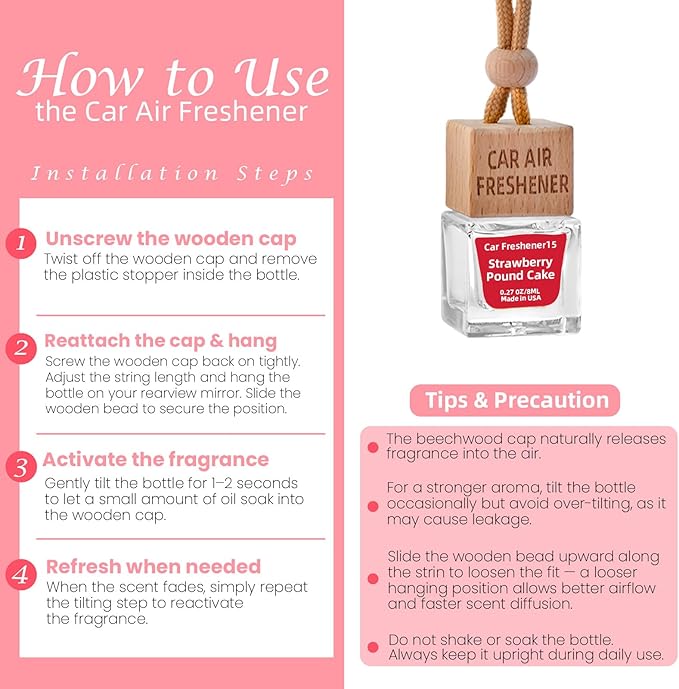 - 【Easy to Install, Adjustable Scent Strength】Our hanging essential oil diffuser installs in just three steps—remove the stopper, screw on the cap, and hang from your rearview mirror. Need a stronger scent? Simply tilt the bottle to let oil touch the wooden cap for an instant boost. The adjustable strap fits any car model without blocking your view, ensuring safe and comfortable driving.