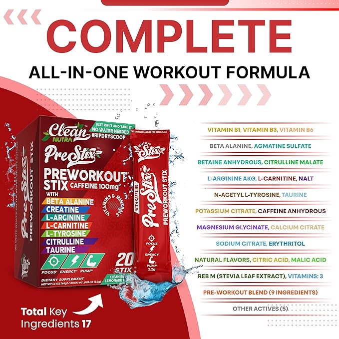 - All-in-One Pre Workout Formula – Pre Stix by Clean Nutra delivers a targeted pre workout blend featuring creatine monohydrate, beta alanine, L-citrulline malate, taurine, caffeine, L-arginine, and L-tyrosine. Designed to support nitric oxide booster routines, creatine gummies, creatine capsules, creatine powder, and gym-focused stacks that include amino acids supplement ingredients and pre workout powder for men or women.