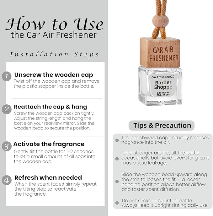 - 【Easy to Install, Adjustable Scent Strength】Our hanging essential oil diffuser installs in just three steps—remove the stopper, screw on the cap, and hang from your rearview mirror. Need a stronger scent? Simply tilt the bottle to let oil touch the wooden cap for an instant boost. The adjustable strap fits any car model without blocking your view, ensuring safe and comfortable driving.