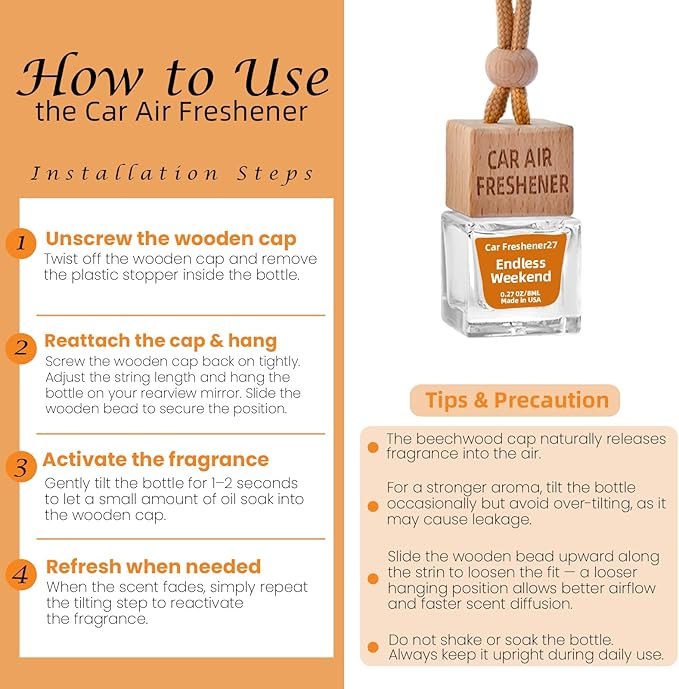- 【Easy to Install, Adjustable Scent Strength】Our hanging essential oil diffuser installs in just three steps—remove the stopper, screw on the cap, and hang from your rearview mirror. Need a stronger scent? Simply tilt the bottle to let oil touch the wooden cap for an instant boost. The adjustable strap fits any car model without blocking your view, ensuring safe and comfortable driving.