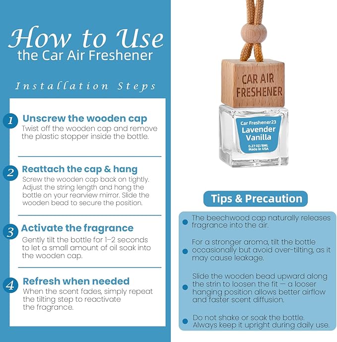 - 【Easy to Install, Adjustable Scent Strength】Our hanging essential oil diffuser installs in just three steps—remove the stopper, screw on the cap, and hang from your rearview mirror. Need a stronger scent? Simply tilt the bottle to let oil touch the wooden cap for an instant boost. The adjustable strap fits any car model without blocking your view, ensuring safe and comfortable driving.