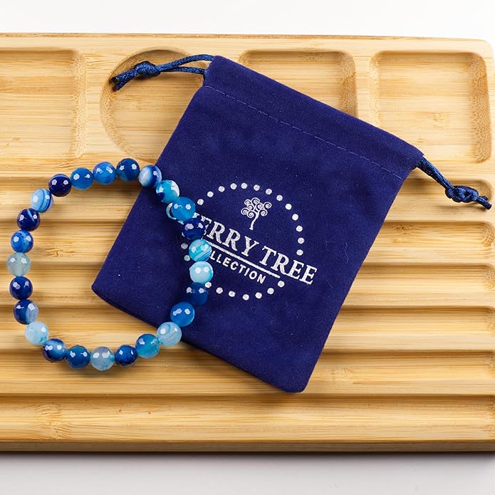 - CONTAINS: A Blue Ice bracelet made with 8mm semi-precious beads packaged inside a protective cloth drawstring pouch. Blue Ice is lace agate which has been dyed a beautiful blue color resulting in tones from white to deep blue.