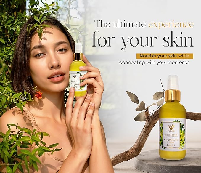 Wild Vibes Ylang Bergamot + Musk Luxury Body Oil – Organic, After Shower for Women with Tropical Oils, Anti-Aging and Hydrating Formula for Smooth, Radiant Skin – 4 oz