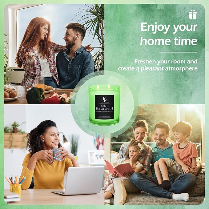 - Fresh Summer Fragrance: Blending natural eucalyptus and cool mint aroma, scented candle for home brings a refreshing fragrance like a forest breeze, instantly awakening vitality, suitable for use in living rooms, study rooms or bathrooms to create a comfortable summer space