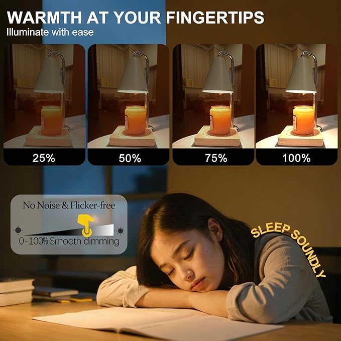 - 【Sleep Light With 4 Brightness & Timing Function】The lamp candle warmer has 4 levels of height temperature adjustable (0%-25%-50%-75%-100%), the stronger the brightness, the faster the candle melts. Moreover, it has 0-2800k magical color temperature. And our candle warmer lamp can be turned off by timer feature 1H/2H/3H/4H, don't need to worry about forgetting the heating time while enjoying the fragrance, with peace of mind sleep and play anytime