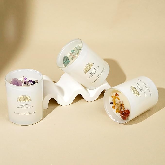 - CRYSTAL VARIETIES: Each candle features a different crystal - Amethyst for peace and balance, Amazonite for wisdom, and Sunstone for motivation and positive energy
