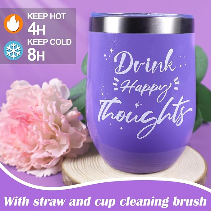 - COOLING AND HEAT PRESERVATION INSULATED VACUUM TUMBLER: Made of food-grade sturdy stainless steel, with double-walled vacuum insulation, this sweat-free 12oz insulated tumbler with lid can preserve beverage temperature up to 8h for cold & 4h for hot, great for iced coffee, tea, wine, juice, champagne, smoothies, sodas, milkshake, etc; "Drink Happy Thoughts", energetic quote brighten her days and make her smile when she enjoy her beverage, making it an ideal relaxation gifts for her friendship gifts for women