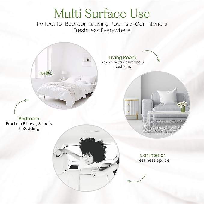 - Multi-Surface Fabric Freshener: Safe for linens, upholstery, clothes, towels, yoga mats, and carpets. This fabric spray freshener eliminates odors and works as an air freshener for couches, closets, and soft furnishings throughout the house.