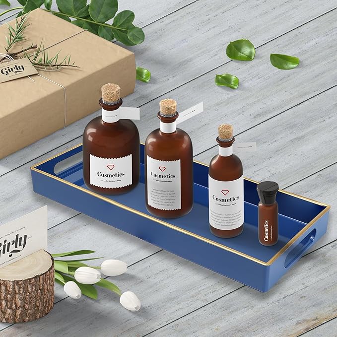 Blue Bathroom Vanity Tray for Countertop, Small Plastic Toilet Tank Versatile Storage & Organization Tray for Makeup, Perfume, Desk, Kitchen, Candles, 13.7"x6"x1.4", 35HB