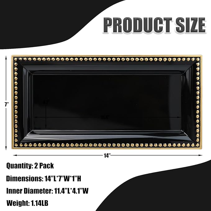 2 Pack Black Bathroom Vanity Tray for Countertop with Beads, Small Plastic Toilet Tank Versatile Storage Organization Tray for Makeup, Perfume, Desk, Kitchen, Candles, 14"x7"x1", 36B