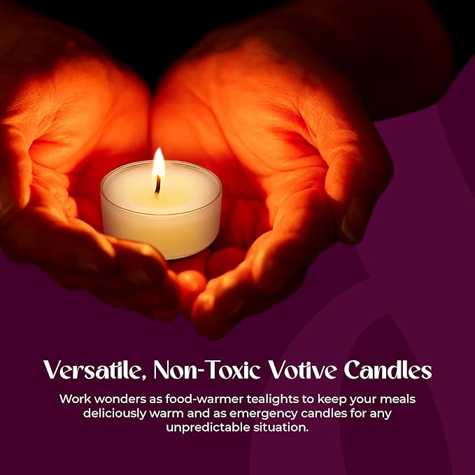 - PACK OF 100 TEA CANDLES FOR ENDLESS EVERYDAY USES: Our long-burning votive candles can be used as Christmas tealight candles, Shabbat tealight candles, Wedding candles, church candles and beyond. You may even use them as tea light warmers for food to impress your family and guests. Coming in a value pack of 100, they are also great for traveling, decorating or as emergency votive candles.