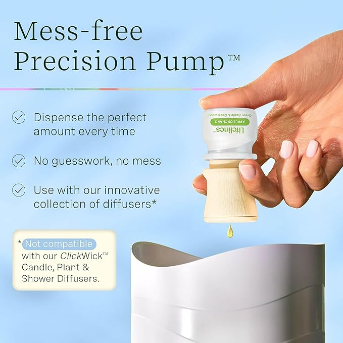 - Mess-Free Precision Pump: Dispense the perfect amount every time with no guesswork and no mess. NOT compatible with our ClickWick Candle, Plant, or Shower diffusers, which require ClickWick Essential Oil Blends.