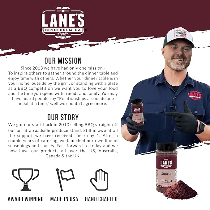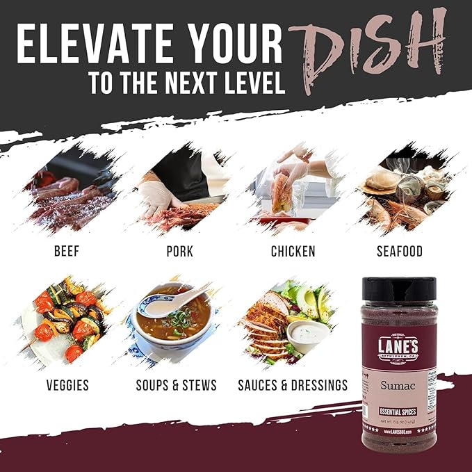 Lane's Ground Sumac Spice, 8.5 oz - Bold & Tangy Sumac Seasoning Powder, Gluten-Free, Authentic Middle Eastern & Mediterranean Spices, Perfect for Meats, Salads, Marinades & Zesty Recipes, Made in USA