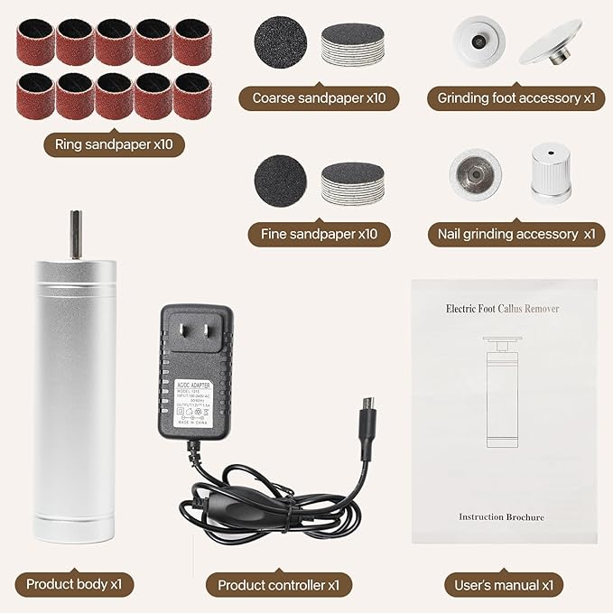 - Replaceable sandpaper: The electric foot callus remover has 20 pieces (coarse sandpaper*10+fine sandpaper*10) of replacement sandpaper discs of different densities and 10 nail sanding rings.