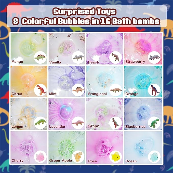 - 16 Colorful Bath Bomb Set for Kids: Our bath bombs contains 16 different individually wrapped dino egg bath bombs with 16 different dinosaur toys inside. The dinosaur toys for kids are made of safe materials, there are 16 scents for your selection in this set,Mango,uanilla,peach,Strawberry,citrus,mint,frangipani,orange,lemon, lavender,grape,Blueberry, cherry,Apple, rose, ocean. Multiple smells give you more choices. Vibrant colors and fizz, kids can enjoy a playful bathtime atmosphere while the delightful scents create an enjoyable sensory experience.
