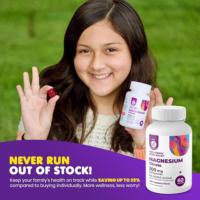 - Stress-Free Family Time: Whether it's after a busy school day or a hectic workday, our magnesium gummy helps both kids and parents relax and recharge. Say hello to brighter, calmer evenings at home.