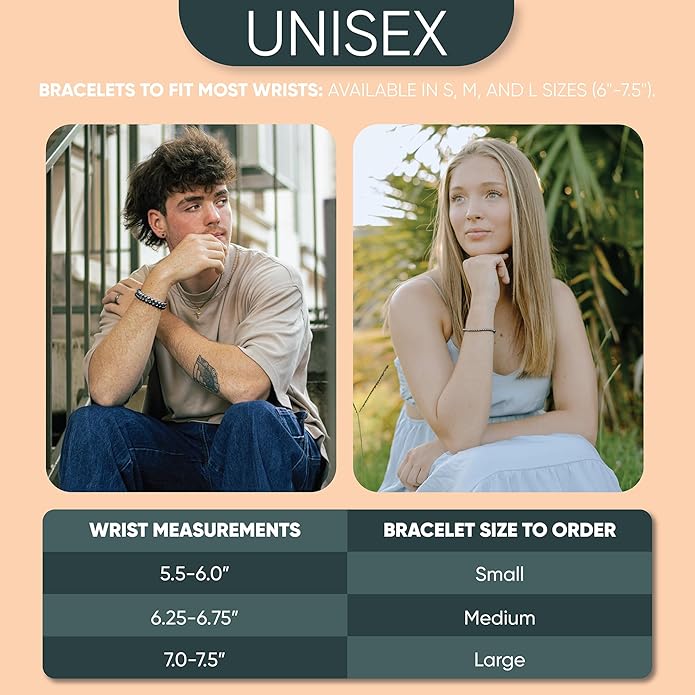 - UNISEX: Three sizes available: Small (6”-6.25”), Medium (6.75”-7”), and Large (7.5”-7.75”). Please measure your wrist at the point you like to wear your bracelets. If between sizes, size up or down depending on if you like your bracelets a little tight or loose. Please see the description below for an easy way to measure your wrist.
