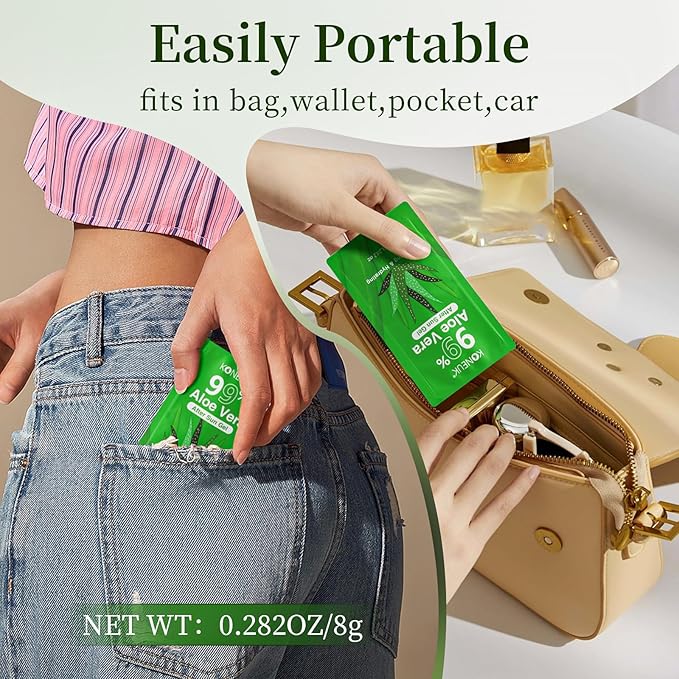 - 【99% Pure Aloe Vera Gel】This set of aloe vera gel has 50 packs,each pack is 0.282oz,each pack of aloe vera gel is individually packaged,which is very suitable for carrying around,when you use these aloe vera gel,you will feel very relaxed and cool,it quickly absorbed,and free of any sticky residue,leaving your skin smooth and moisturized