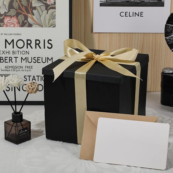 Gift Box with Lid 7x7x6.5 Inches, Black Gift Boxes for presents Packaging for Birthdays, Valentine's Day, Christmas, Anniversaries (Include Shredded Paper Fill, Envelope Card Ribbon)