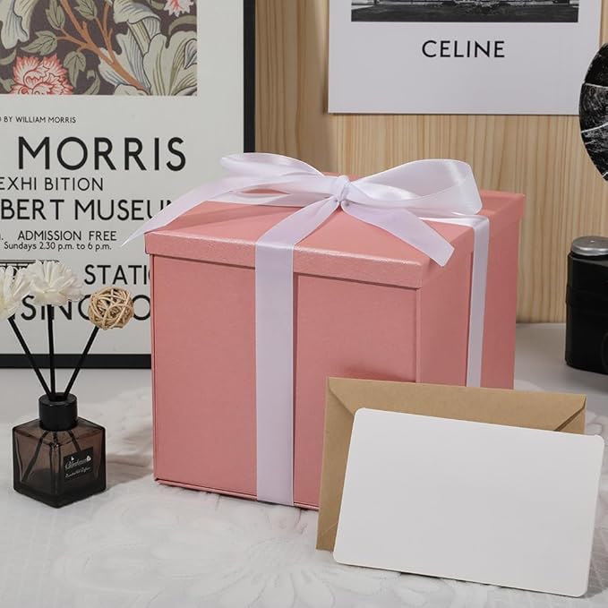 Gift Box with Lid 7x7x6.5 Inches, Pink Gift Boxes for presents Packaging for Birthdays, Valentine's Day, Christmas, Anniversaries (Include Shredded Paper Fill, Envelope Card Ribbon)