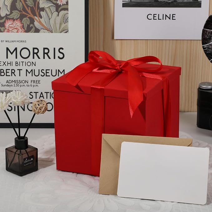 Gift Box with Lid 7x7x7 Inches, Red Gift Boxes for presents Packaging for Birthdays, Valentine's Day, Christmas, Anniversaries (Include Shredded Paper Fill, Envelope Card Ribbon)