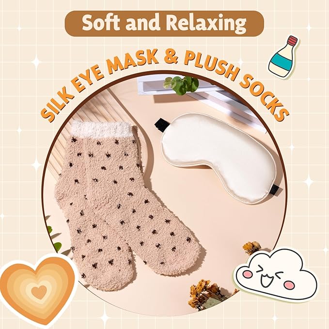 - 【9 PCS UNIQUE GIFTS FOR WOMEN】Our gift baskets for women is filled with stylish, colorful items that are unique and high quality, including: (1) Small Ceramic Coffee Mug(May randomly include a tea spoon or a fork) | (2) Silk Eye Mask | (3) Plush Fuzzy Socks | (4) Scented Candle | (5) Leather Journal Travelers Notebook | (6) Black Pens | (7) Hand Cream | (8) Oatmeal Coconut Soap Bar | (9) Greeting Gifts Card | (10) Cute Gift Box. (See pictures for details)