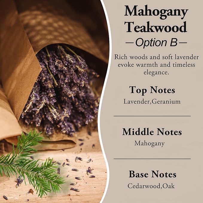 - Option B/Warm & Elegant Mahogany: A calming blend that opens with the soothing scent of lavender and geranium. The heart reveals a rich, warm mahogany note, followed by a grounding base of cedarwood and oak. This sophisticated fragrance evokes the feeling of a cozy, wooded retreat, blending woodsy depth with floral freshness.