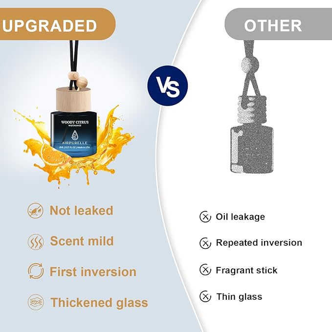 - 【Aromatic Variety】The scents of our car air fresheners are Citrus Musk, Spicy Sandalwood, Saffron Amber, Amber Vanilla and Woody Citrus, from sweet fruit aroma to intense woody aromas, They are all the most popular perfumes on the market, from fashionable urban women to successful mature men, AirPurelle car air freshener there is always a fragrance that belongs to you