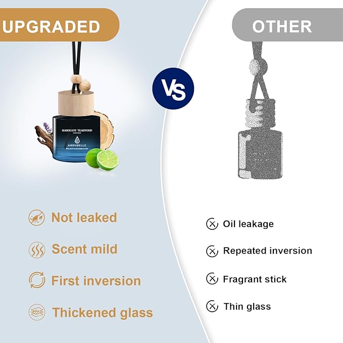 - 【Easily Installed】The upgraded car air freshener glass bottle can store 8ml volume of perfume(two bottles of aroma lasts at least 90+ days). Simply install the wooden stick into the bottle when using it for the first time, and invert the bottle for 10 seconds, let the fragrance soak through the bottle cap, and then use the attached rope to hang it from the rearview mirror, air freshener will not hinder the line of sight but also enhance the delicacy of the car