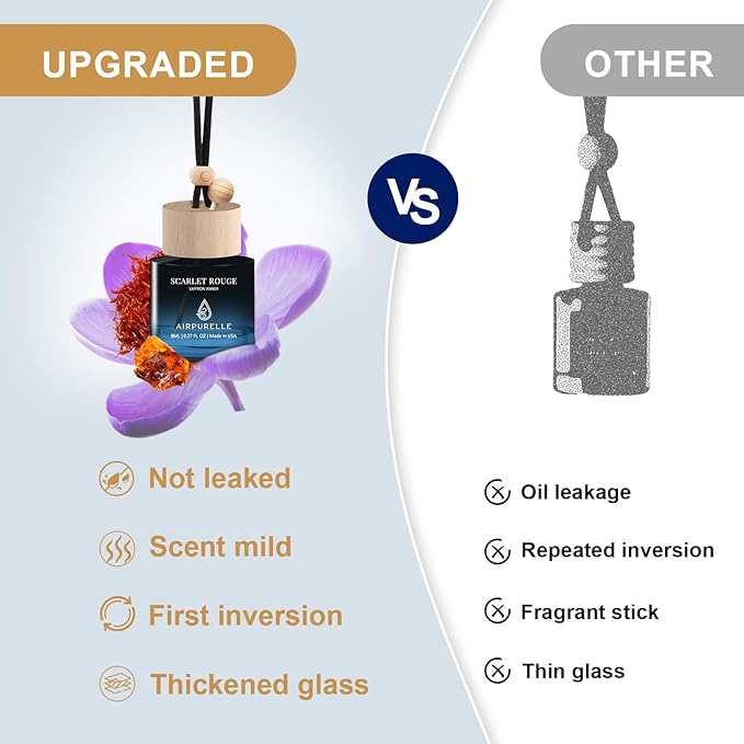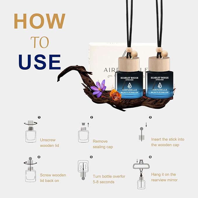 - 【Easily Installed】The upgraded car air freshener glass bottle can store 8ml volume of perfume(two bottles of aroma lasts at least 90+ days). Simply install the wooden stick into the bottle when using it for the first time, and invert the bottle for 10 seconds, let the fragrance soak through the bottle cap, and then use the attached rope to hang it from the rearview mirror, air freshener will not hinder the line of sight but also enhance the delicacy of the car