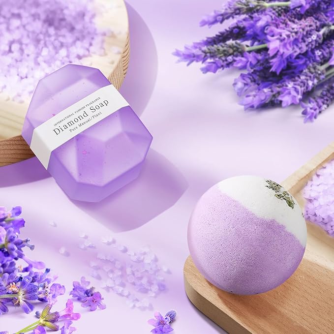 - LAVENDER SPA GIFTS FOR WOMEN: Crafted with natural wax and pure essential oils, this 4oz lavender candle burns clean for 30+ hours—no smoke, just pure relaxation. Paired with fizzy bath bombs and diamond handmade soap, this set fills her bath with calming lavender bliss. Perfect as friendship gifts for women, get well soon gifts, or just-because self care gifts to melt away stress and anxiety.