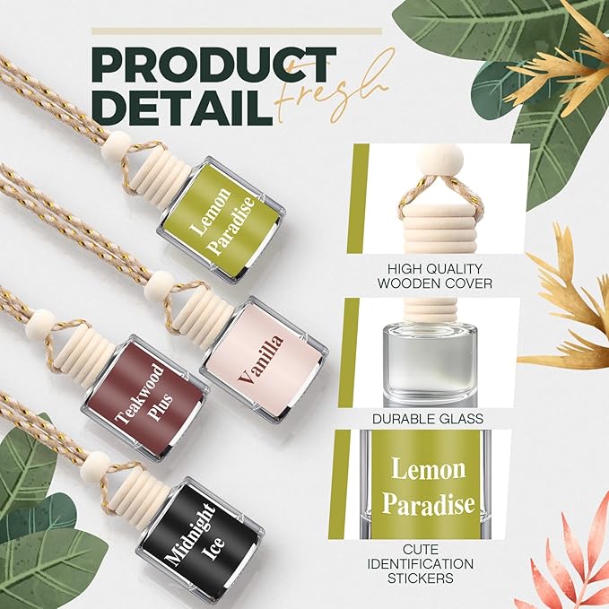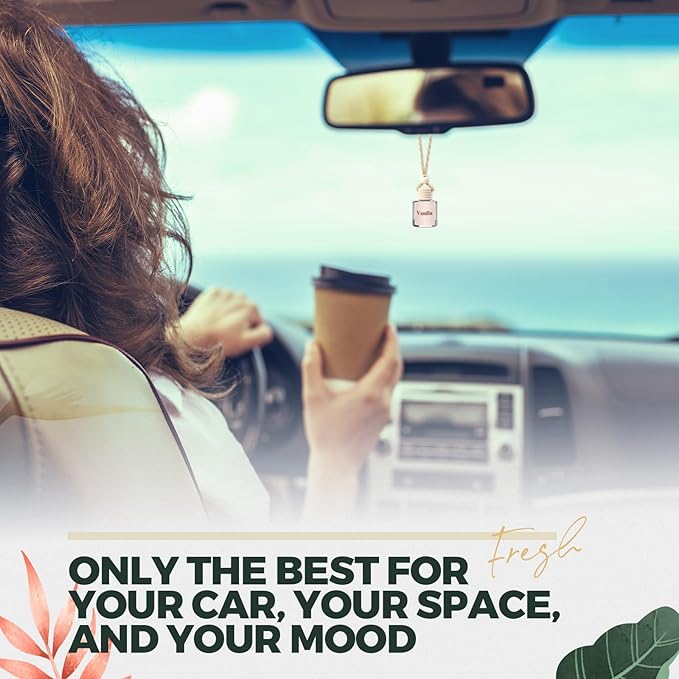 - Convenient and Safe Hanging Design: each scented car freshener hanging oil includes durable strings and adhesive labels for easy installation on your rearview mirror; Designed to stay securely in place without obstructing your vision, these fresheners maintain a clear interior while delivering continuous fragrance; each car diffusers is pre-filled and designed for refillable use, reducing waste