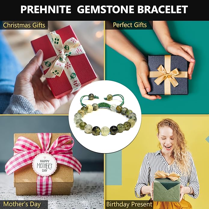 - READY TO GIFT: This adjustable healing gemstone bracelet is ready for gifting. Perfect for stocking stuffers or as a thoughtful gesture for friends and family, its elegant packaging complements its spiritual and aesthetic appeal, making the prehnite epidote beaded bracelet an ideal choice for all celebrations.