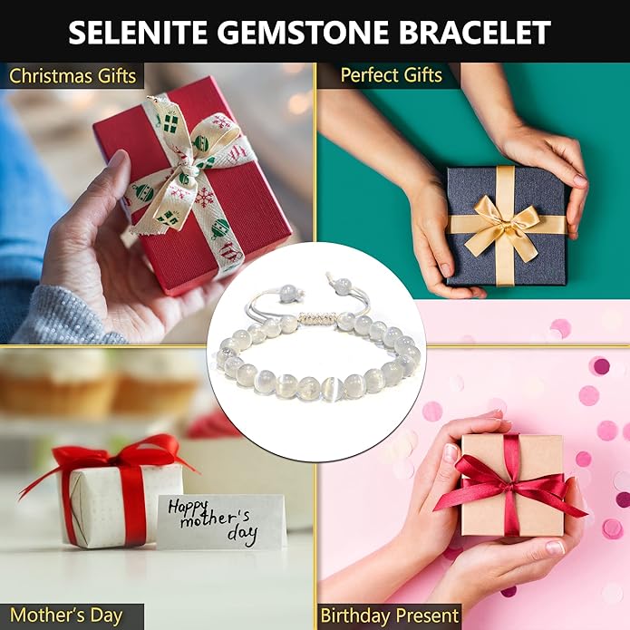 - READY TO GIFT: This adjustable healing gemstone bracelet is ready for gifting. Perfect for stocking stuffers or as a thoughtful gesture for friends and family, its elegant packaging complements its spiritual and aesthetic appeal, making the selenite beaded bracelet an ideal choice for all celebrations.