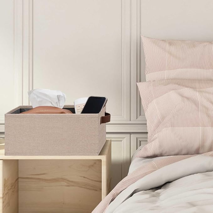 - 👍【QUALITY MATERIAL】Storage baskets for shelves are made of high-quality cationic fabric and polyester cotton fabric, and the inner layer is made of non-woven fabric, which is odorless, long-lasting and strong. Classic faux leather handles that adds a comfortable touch and provides a strong and comfort grip to pull and move. Fabric storage bin is easy to clean, just wipe with a damp sponge or cloth