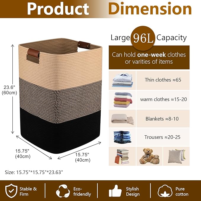 - Oversized Laundry Hamper: 15.7"*15"*23.6"extra large laundry basket. Super large capacity of 96 L, which can meet the clothing storage needs of a family for a week. Large basket can also store bulky items like blankets, comforters, duvets, throw pillows