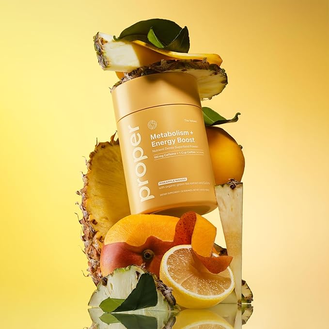Proper, The Yellows Metabolism and Energy Boost, Sugar Free Energy Drink Powder with 100mg Caffeine. 30 Servings, Pineapple Mango Drink Mix for Men and Women