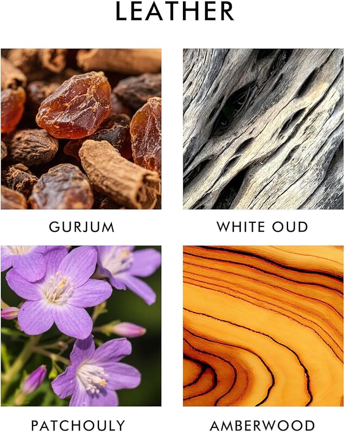 - Leather: A bold, masculine scent blending smoky gurjum, white oud, patchouli, and amberwood. Like the feel of a leather seat and the hum of the engine, it brings a sense of power and sophistication to every drive