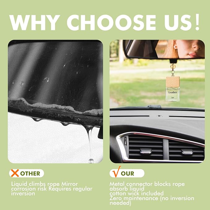 - Hanging Design: Lightweight and elegant, hangs on the rearview mirror with adjustable length. Gently sways to diffuse scent, enhancing every drive with a pleasant aroma