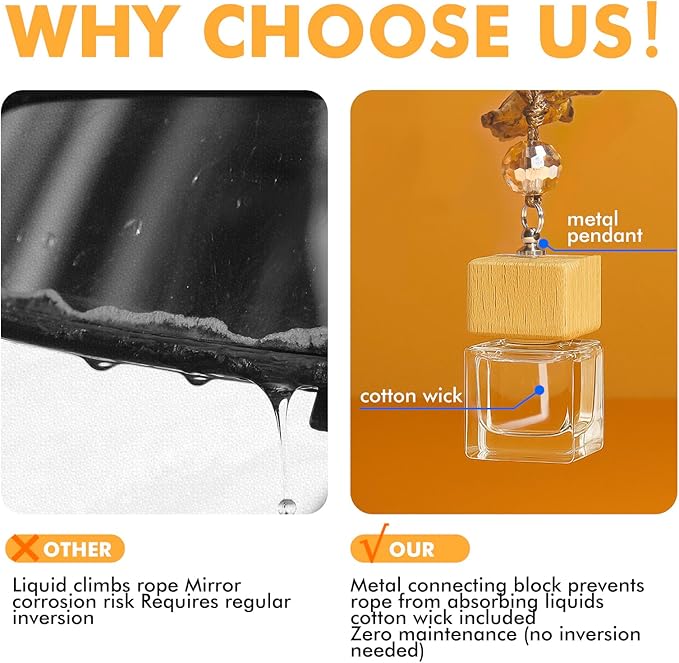 - Hanging Design: Lightweight and elegant, hangs on the rearview mirror with adjustable length. Gently sways to diffuse scent, enhancing every drive with a pleasant aroma