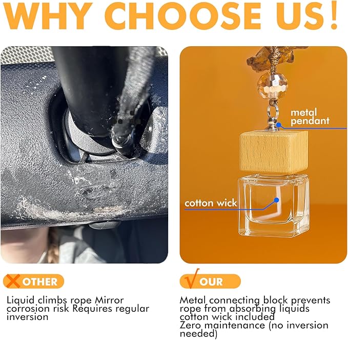 - Hanging Design: Lightweight and elegant, hangs on the rearview mirror with adjustable length. Gently sways to diffuse scent, enhancing every drive with a pleasant aroma
