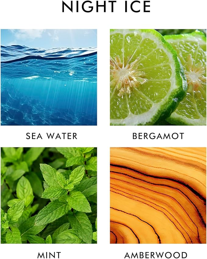 - Night Ice: A crisp, masculine scent that opens with cool sea water and zesty bergamot, refreshed by a hint of mint. As it settles, smooth amberwood adds depth and warmth, evoking the sensation of a night drive by the ocean—clean, confident, and effortlessly bold