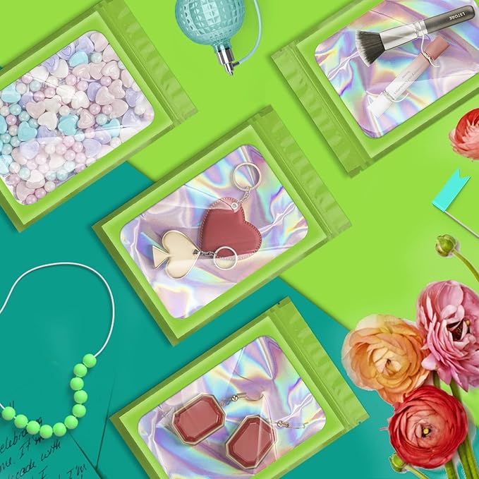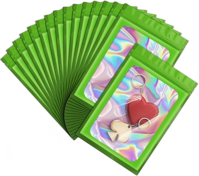 ANZNKU 100 Pcs Smell Proof Mylar Resealable Bags, Holographic Packaging Bags, Resealable Odor Foil Pouch Zip Bag with Clear Window for Food Storage and Lipgloss, Jewelry Lash (Green, 5.5 x 7.9 Inch)
