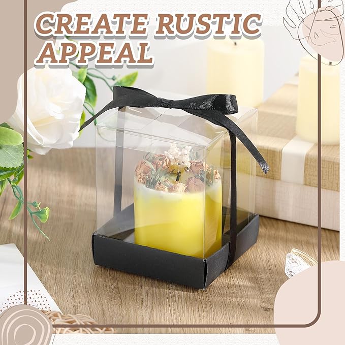 Cunno 36 Set 3.5 x 3.5 x 4.3 in Candle Package Transparent Gift Box 4-18 oz Handmade Tealight Candle Holder Bulk Paper Bottom Ribbon for Wedding Baby Shower Party Mug Cake Wine Glasses(Black)