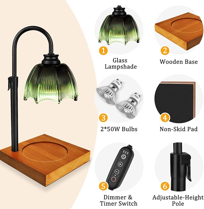 - Elegant Design & Adjustable Height: Our candle warmer lamp features a unique design with a wood base, metal stand, and vintage-style glass shade. The adjustable-height pole accommodates jar candles of various sizes. Its stylish look fits perfectly in living rooms, bedrooms, offices, yoga studios, or cafés—ideal for creating a calming atmosphere whether you're working, meditating, or winding down for the night
