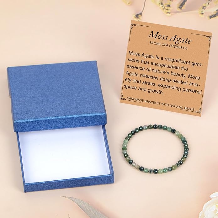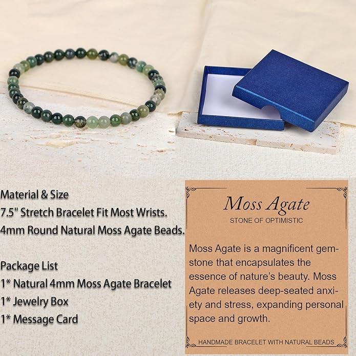- Perfect Gift: This Moss Agate crystal bracelet comes with a message card. The bracelet is packaged in a premium jewelry box ready for gift. An exceptional gift for your family, friends and colleagues.